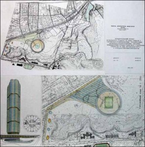 "Цей комплекс повинний розміститися на вільній від будівництва земельній ділянці площею 5,8 га, а також гостьовою автостоянкою (4,5 га) між станціями метро "Голосіївськая площа" і "Національний Експоцентр України", біля зупинки громадського транспорту "Коломиївська", де знаходиться 15-метрова яма. Зараз вона не придатна для відпочинку киян, оскільки в ній відстоюються забруднені дощові води, - говорить головний архітектор і головний інженер проект Олександра Жуків.